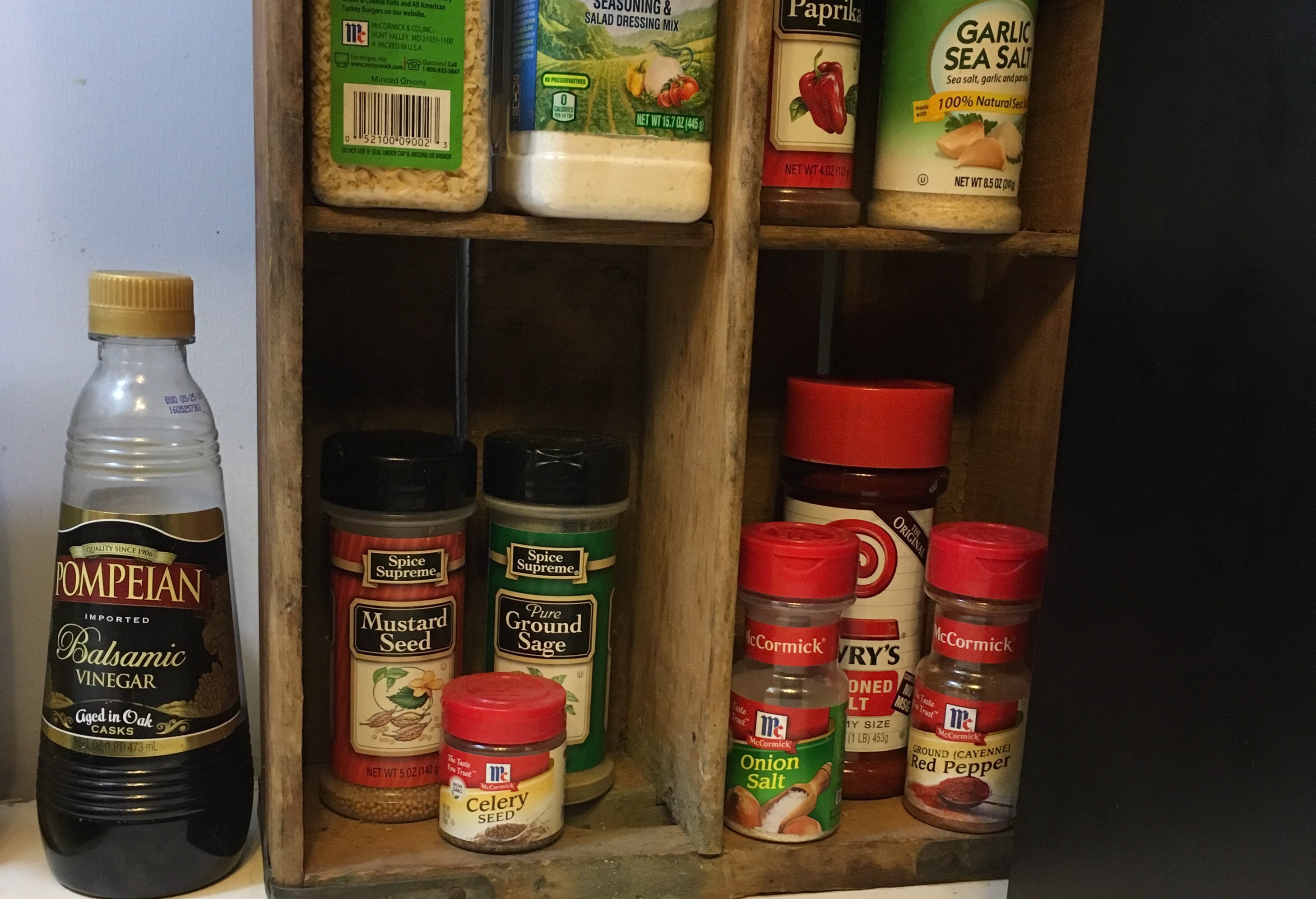 There is more I love about my kitchen. I love the pig shaped cutting board that a good girlfriend of mine MADE and gave us for a wedding gift… I love the brown stoneware mixing bowls Hubby bought me when we were dating… I love the old Pepsi crate he bought me at an antique store. It makes a perfect spice rack.
