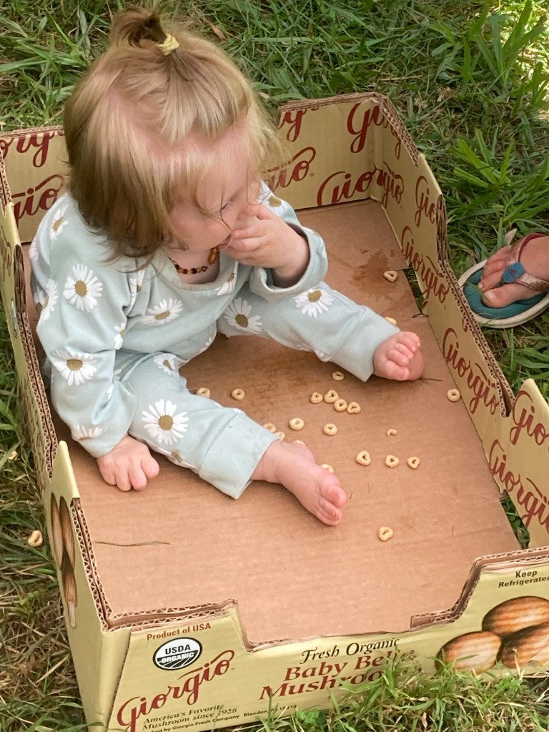 She is starting to say some words, and her siblings are so delighted when they hear her say “hey mama” or “num-num” or “choc” which is her way of begging for chocolate. She says “joosh” when she is thirsty, and “no-no” when she’s doing something she knows she shouldn’t, and “stop!” if she sees her Papa give me a hug. 😂 Every large bird she sees is a “tuhkey” and every small animal is a “catty-catty-cat.”