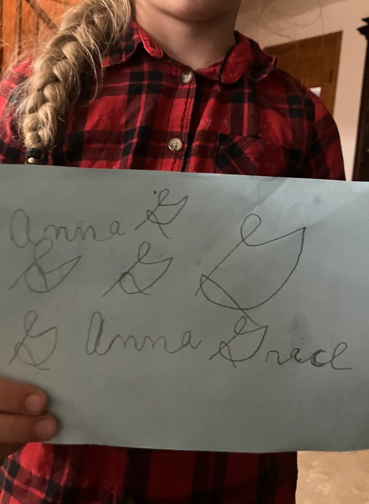 Her Papa is very pleased with her progress in cursive writing. His school didn’t require it, but he was taught it by his Grandmother, and believes it’s a very important skill❤️