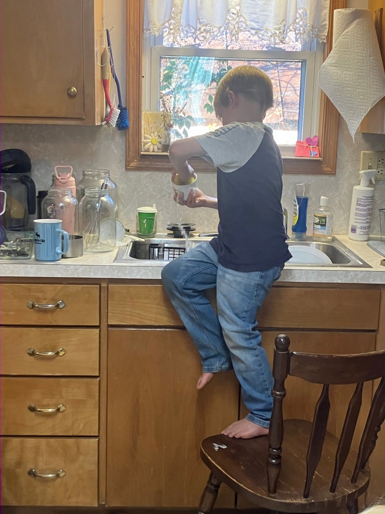 He’s recently decided he likes washing dishes, so he’s been doing lots of that lately.