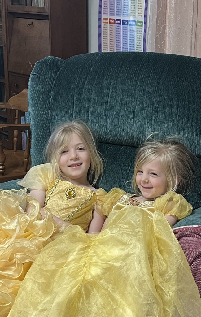 Ruth is imaginative in an Anne of Green Gables kind of way. She lives in her own little dream world. Practicality is not part of her makeup at this point. We love to see her imaginative little mind at work. Right now, she and Elizabeth are really into dressing up as princesses and pretending to be twins. 🙂