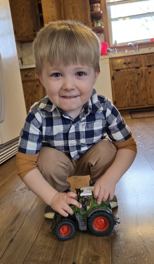 He came home with a new tractor, and also.. imagine how hard we laughed when we drove by the John Deere dealership after picking him up from her house, and his little voice in the backseat, shouted out: “John Deere tractors… umm… FENDT TRACTORS!!! FENDT TRACTORS! FENDT TRACTORS!” We howled. 🤣